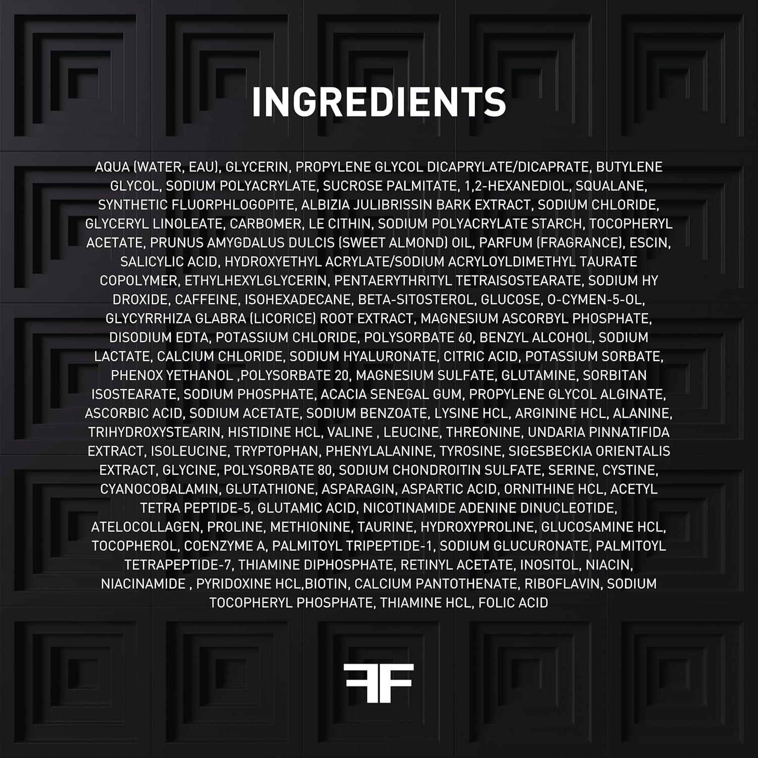 Aqua (Water, Eau), Glycerin, Propylene Glycol Dicaprylate/Dicaprate, Butylene Glycol, Sodium Polyacrylate, Sucrose Palmitate, 1,2-Hexanediol, Squalane, Synthetic Fluorphlogopite, Albizia Julibrissin Bark Extract, Sodium Chloride, Glyceryl Linoleate, Carbomer, Lecithin, Sodium Polyacrylate Starch, Tocopheryl Acetate, Prunus Amygdalus Dulcis (Sweet Almond) Oil, Parfum (Fragrance), Escin, Salicylic Acid, Hydroxyethyl Acrylate/Sodium Acryloyldimethyl Taurate Copolymer, Ethylhexylglycerin, Pentaerythrityl Tetraisostearate, Sodium Hydroxide, Caffeine, Isohexadecane, Beta-Sitosterol, Glucose, O-Cymen-5-Ol, Glycyrrhiza Glabra (Licorice) Root Extract, Magnesium Ascorbyl Phosphate, Disodium Edta, Potassium Chloride, Polysorbate 60, Benzyl Alcohol, Sodium Lactate, Calcium Chloride, Sodium Hyaluronate, Citric Acid, Potassium Sorbate, Phenoxyethanol, Polysorbate 20, Magnesium Sulfate, Glutamine, Sorbitan Isostearate, Sodium Phosphate, Acacia Senegal Gum, Propylene Glycol Alginate, Ascorbic Acid, Sodium Acetate, Sodium Benzoate, Lysine HCl, Arginine HCl, Alanine, Trihydroxystearin, Histidine HCl, Valine, Leucine, Threonine, Undaria Pinnatifida Extract, Isoleucine, Tryptophan, Phenylalanine, Tyrosine, Sigesbeckia Orientalis Extract, Glycine, Polysorbate 80, Sodium Chondroitin Sulfate, Serine, Cystine, Cyanocobalamin, Glutathione, Asparagine, Aspartic Acid, Ornithine HCl, Acetyl Tetrapeptide-5, Glutamic Acid, Nicotinamide Adenine Dinucleotide, Atelocollagen, Proline, Methionine, Taurine, Hydroxyproline, Glucosamine HCl, Tocopherol, Coenzyme A, Palmitoyl Tripeptide-1, Sodium Glucuronate, Palmitoyl Tetrapeptide-7, Thiamine Diphosphate, Retinyl Acetate, Inositol, Niacin, Niacinamide, Pyridoxine HCl, Biotin, Calcium Pantothenate, Riboflavin, Sodium Tocopheryl Phosphate, Thiamine HCl, Folic Acid