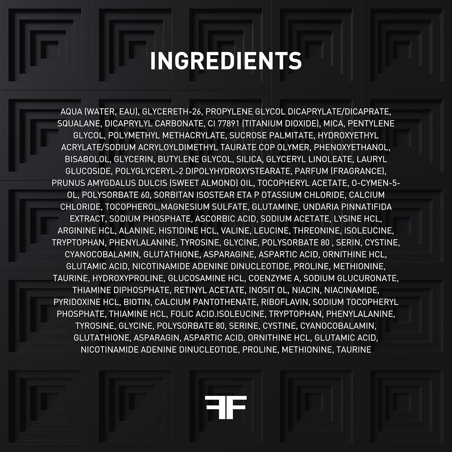 AQUA (WATER, EAU), GLYCERETH-26, PROPYLENE GLYCOL DICAPRYLATE/DICAPRATE, SQUALANE, DICAPRYLYL CARBONATE, CI 77891 (TITANIUM DIOXIDE), MICA, PENTYLENE GLYCOL, POLYMETHYL METHACRYLATE, SUCROSE PALMITATE, HYDROXYETHYL ACRYLATE/SODIUM ACRYLOYLDIMETHYL TAURATE, COPOLYMER, PHENOL BISABOLOL, GLYCERIN, BUTYLENE GLYCOL, SILICA, GLYCERYL LINOLEATE, LAURYL GLUCOSIDE, POLYGLYCERYL-2 DIPOLYHYDROXYSTEARATE, PARFUM (FRAGRANCE), PRUNUS AMYGDALUS DULCIS (SWEET ALMOND) OIL, TOCOPHERYL ACETATE, O-CYMEN-5-OL, POLYSORBATE 60, SORBITAN ISOSTEARATE , SODIUM CHLORIDE, CITRIC ACID, BENZYL ALCOHOL, GLYCYRRHIZA GLABRA (LICORICE) ROOT EXTRACT, MAGNESIUM ASCORBYL PHOSPHATE, SODIUM HYALURONATE, TIN OXIDE, POTASSIUM SORBATE, ACHILLEA MILLEFOLIUM EXTRACT, XANTHAN GUM, GLUCOSE, CYSTOSEIRA TAMARISCIFOLIA EXTRACT, POTASSIUM, CHLORASSIUM, CHLORASSIUM TOCOPHEROL,MAGNESIUM SULFATE, GLUTAMINE, UNDARIA PINNATIFIDA EXTRACT, SODIUM PHOSPHATE, ASCORBIC ACID, SODIUM ACETATE, LYSINE HCL, ARGININE HCL, ALANINE, HISTIDINE HCL, VALINE, LEUCINE, THREONINE, ISOLEUCINE, TRYPTOPHAN, PHENYLALANINE, TYROSINE, GLYCINE, POLYSORBATE, 80, SERINE CYSTINE, CYANOCOBALAMIN, GLUTATHIONE, ASPARAGIN, ASPARTIC ACID, ORNITHINE HCL, GLUTAMIC ACID, NICOTINAMIDE ADENINE DINUCLEOTIDE, PROLINE, METHIONINE, TAURINE, HYDROXYPROLINE, GLUCOSAMINE HCL, COENZYME A, SODIUM GLUCURONATE, THIAMINE DIPHOSPHATE, RETINYL ACETATE, INOS, NIACINAMIDE, , NIACINAMIDE, PYRIDOXINE HCL, BIOTIN, CALCIUM PANTOTHENATE, RIBOFLAVIN, SODIUM TOCOPHERYL PHOSPHATE, THIAMINE HCL, FOLIC ACID.ISOLEUCINE,Directions