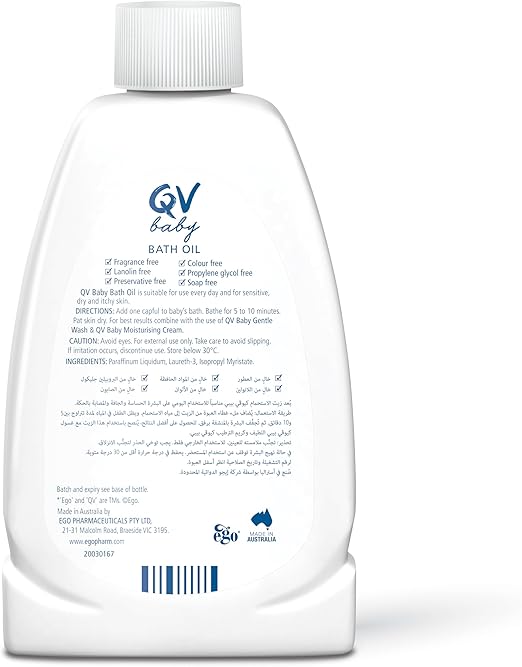 Add one capful to the baby’s bath. Bathe for 5 to 10 minutes. Pat skin dry. For best results, combine with the use of QV Baby Gentle Wash and QV Baby Moisturising Cream.| Weight | 250 kg |